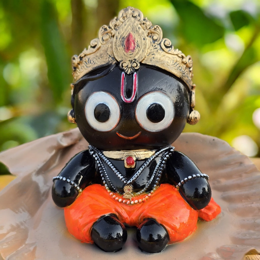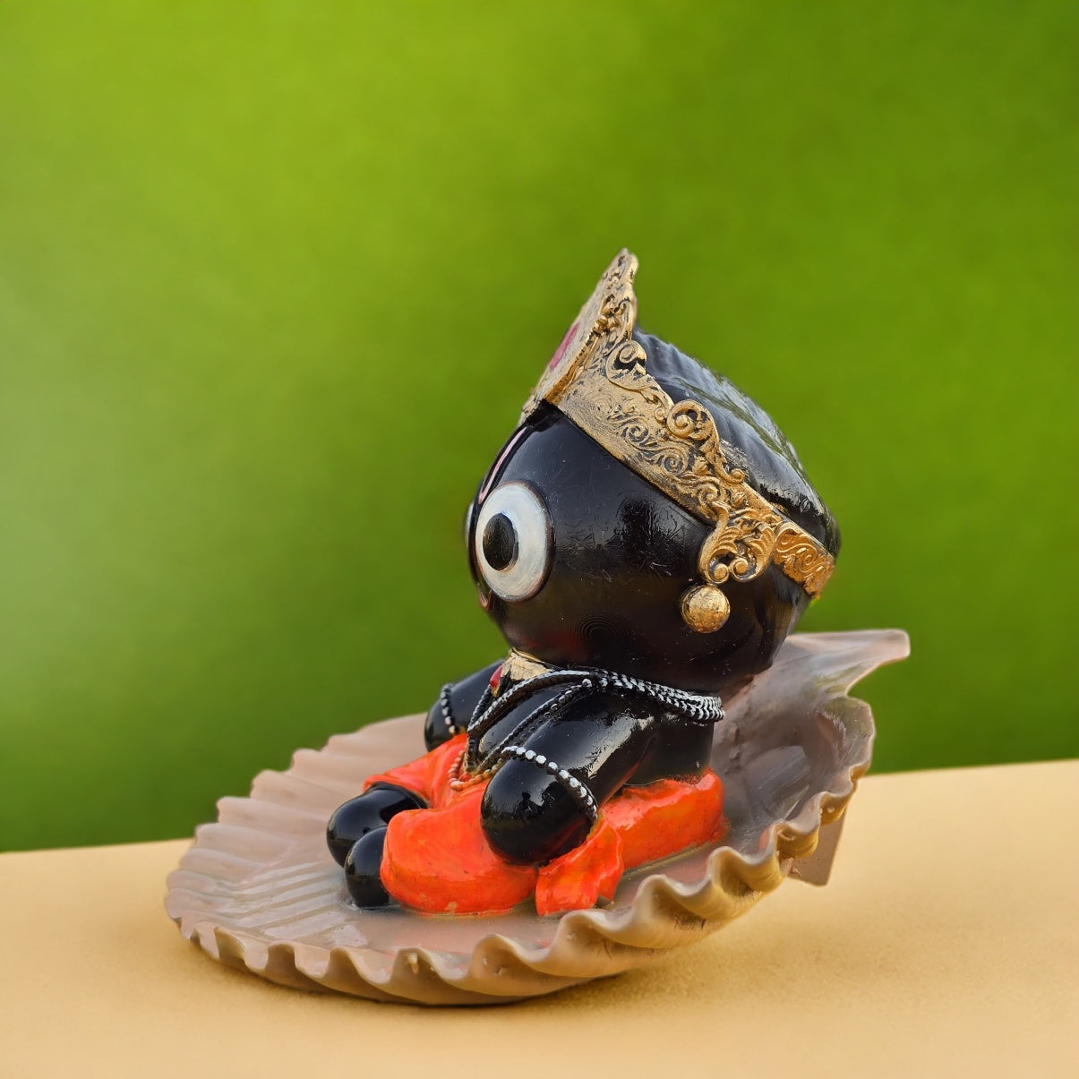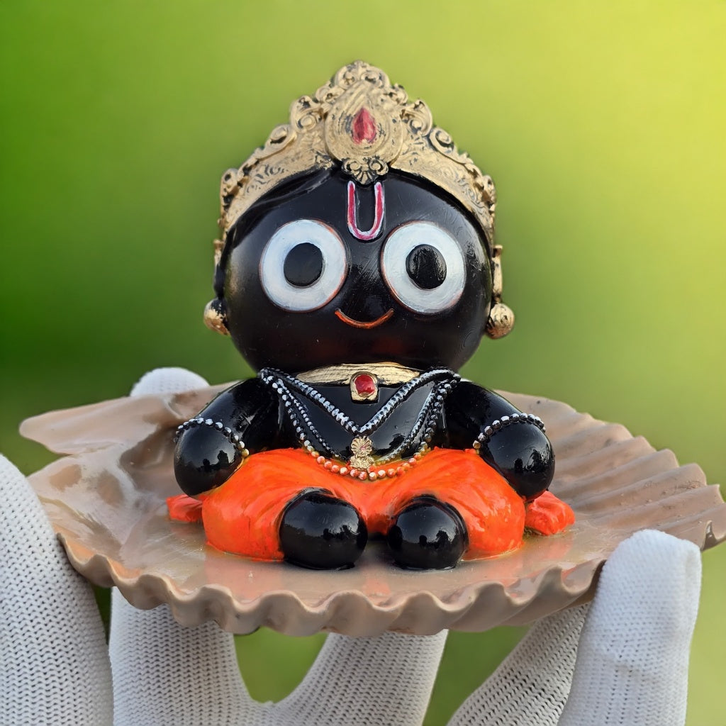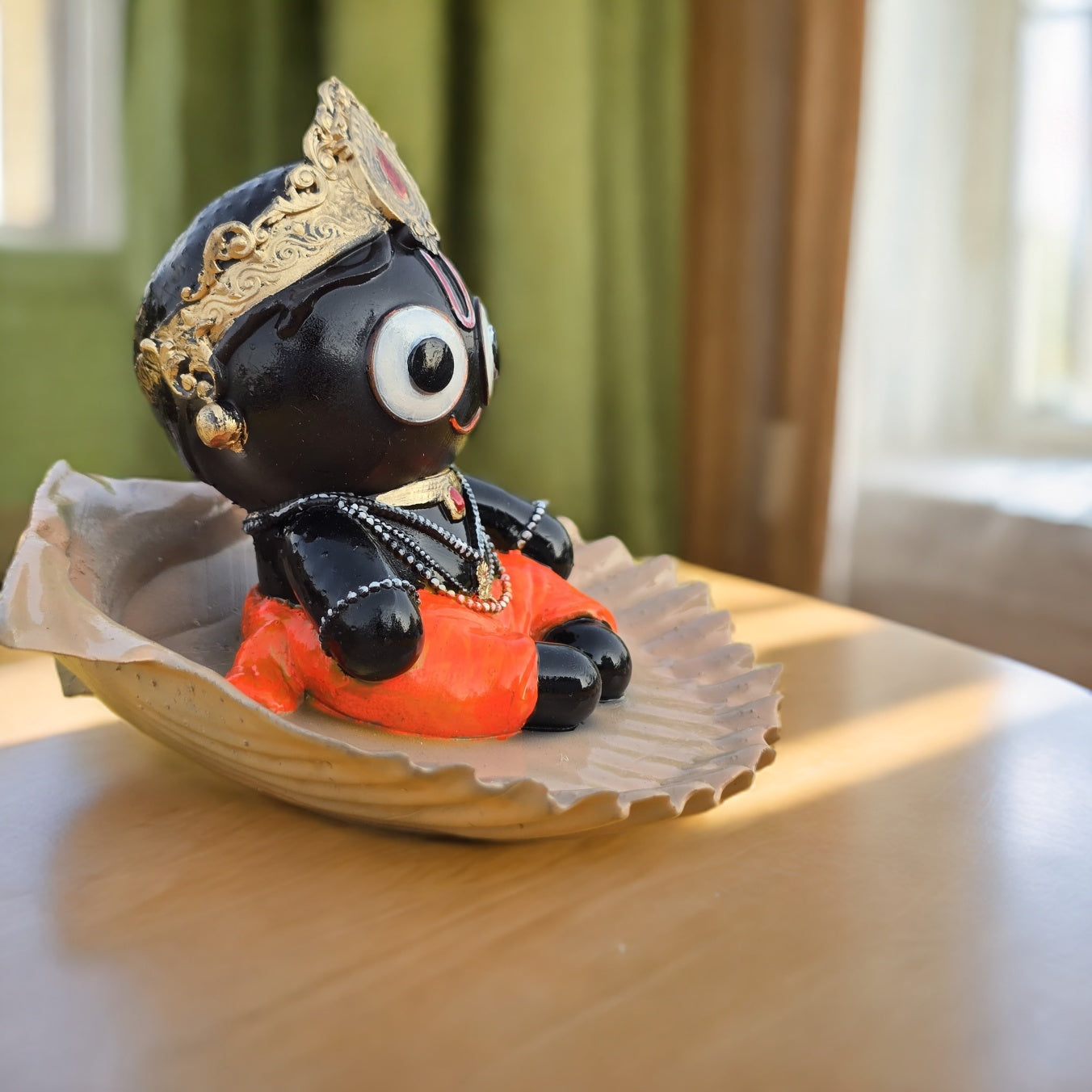 This adorable idol captures Lord Jagannath in his child form, seated gracefully on a beautifully sculpted shankh (conch shell) base, symbolizing purity and auspiciousness. With expressive wide eyes, a gentle smile, and intricately designed ornaments, this murti radiates joy, protection, and spiritual charm.