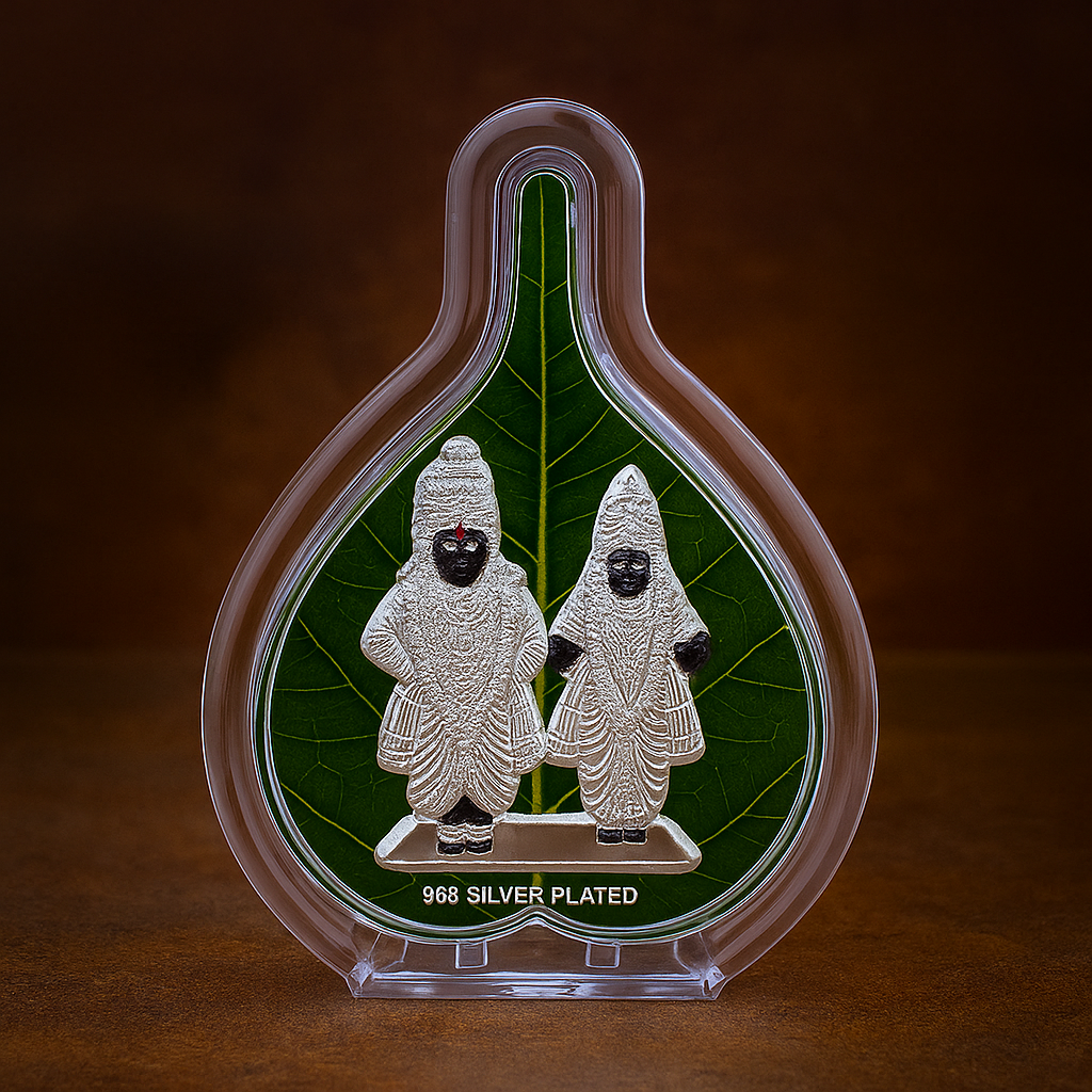 Invite blessings of Lord Vitthal (Vithoba) and Maa Rukmini (Rakhumai) into your life with this exquisitely crafted silver plated idol. Encased in a stylish teardrop acrylic frame with a sacred Peepal leaf background, this devotional piece is a symbol of bhakti, strength, and harmony.